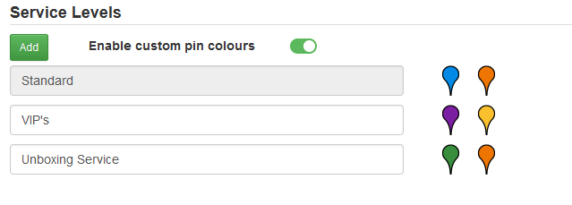 Once you’ve added your ‘Service Levels’ click on the ‘Enable custom pin colours’ toggle, if it is not already turned on.